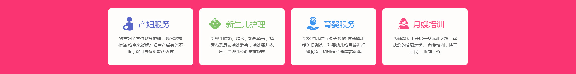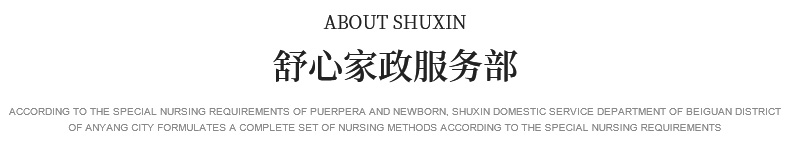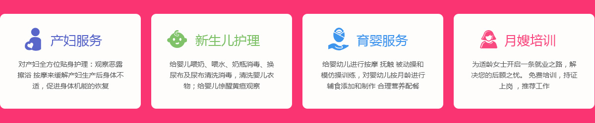 關(guān)于我們 產(chǎn)婦服務 新生兒護理 育嬰服務 月嫂培訓 催乳師培訓 舒心家政 月子餐 資質(zhì)榮譽 服務案例